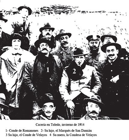 La caza es sin duda alguna el entretenimiento de mayor consideración entre la aristocracia de la época. Caza mayor o menor, ojeos, a caballo, al salto con perro, rececho y batidas o monterías... de todo tipo y desarrolladas en las extensísimas fincas, propias o de amigos, de miles de hectáreas situadas en la Mancha, Extremadura Andalucía o incluso en las cercanías de la capital. En estas cacerías las mujeres también tomaban parte de forma activa pero raramente al nivel en que lo hacía María Concepción, como lo prueba la fotografía bajo estas líneas y referida a una celebrada en Toledo en el invierno de 1914, el año de su boda, en donde ella luce su palmito entre un grupo de adustos y bigotudos varones. |