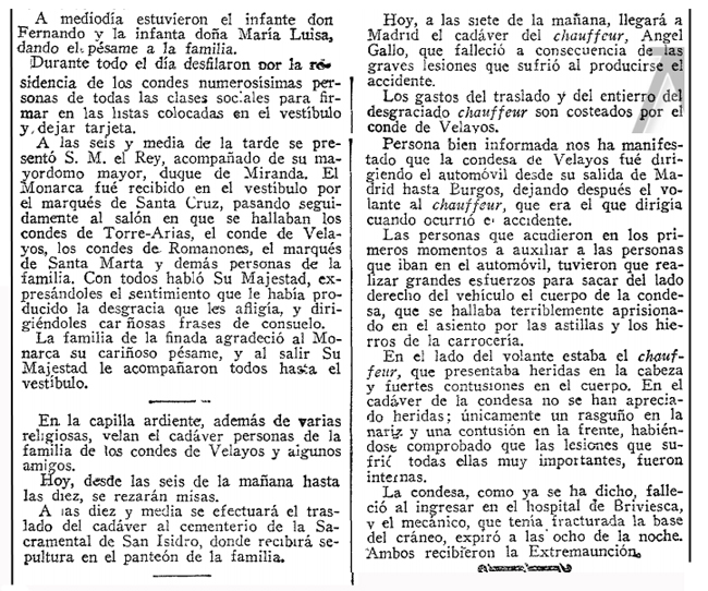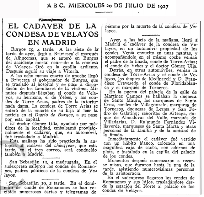 El ABC informa de que, como lógicamente debía ser preceptivo ya en la época, se le practicó la autopsia al "chauffeur". Por un absurdo pudor omite la noticia sobre la realizada a la Condesa, quizás para no "herir" los sentimientos de la familia. Sin embargo el periódico "LA VOZ" sí que se hizo eco del informe de su autopsia y en un suelto con el título "EL RESULTADO DE LA AUTOPSIA" incluido en la página 3 de su edición del 20 de julio dice con precisión: "El médico forense doctor Canseco practicó la autopsia en el cadáver de la condesa. Apreció el doctor Canseco múltiples destrozos en todo el cuerpo, una fractura entre las vértebras primera y segunda, que debió causar la muerte instantánea; fractura de tres costillas del lado derecho, con lesiones del hígado y otros magullamientos, producidos por las maderas y hierros de la carrocería". Todo ello en clara discordancia con las noticias iniciales que afirmaban que la condesa ingresó en el hospital de Briviesca todavía con vida y que incluso allí llegó a pronunciar unas pocas palabras. Y solo una pequeña llamada de atención sobre un breve y perdido párrafo en la noticia que antecede: "Los gastos del traslado y del entierro del desgraciado chauffeur son costeados por el conde de Velayos". Increible, pero cierto.... |