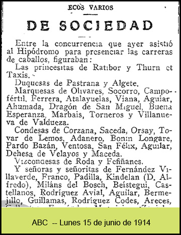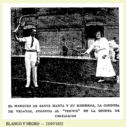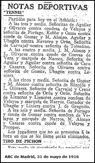 Es en el tenis donde nuestra protagonista brilla con mayor intensidad. Magnífica jugadora (a pesar de las poco ortodoxas poses que lucen los hermanos en la fotografía que hemos datado como previa a su boda), es competidora imprescindible en todos los concursos sociales que se desarrollan en los elegantes "clubs" madrileños. Así lo podemos comprobar en la noticia del ABC que nos detalla la programación de sus partidos en el "Athletic Club" en fecha cercana a la que había dado a luz a su primera hija, Isabel, que en su día casaría con el hijo mayor del Duque de Tamames. |