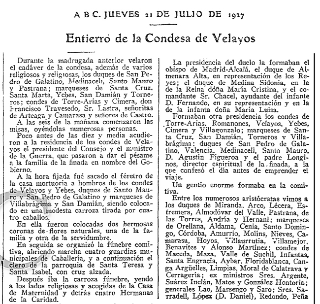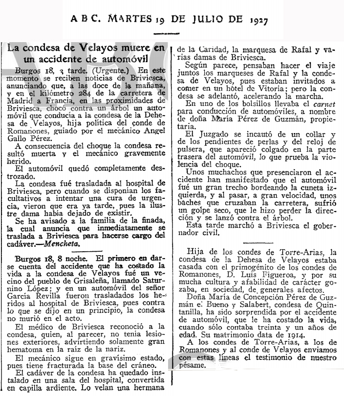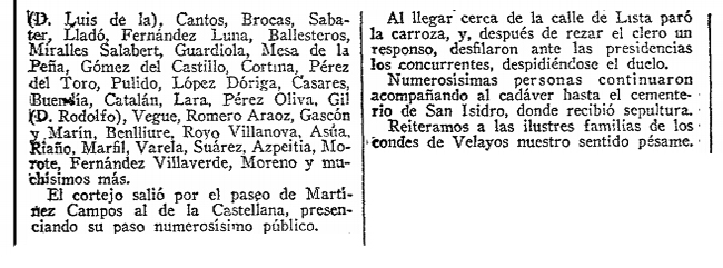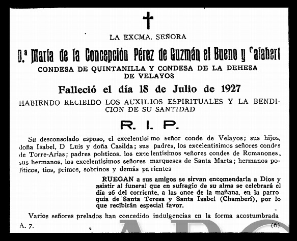 La esquela de María Concepción pone cierre a nuestra historia. Pero antes de terminar nos vamos a permitir un breve, y algo ácido, comentario: Al desconsolado esposo, el excelentímo señor conde de Velayos, el desconsuelo le duró bien poco pues el 29 de julio de 1929, apenas dos años después, contrae nuevo matrimonio con la bella señorita Blanca María de Borbón y de León. Palabras, dichas o escritas, y hechos. |