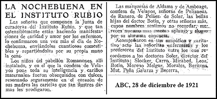 Pero no solo a estas actividades mundanas dedicaba sus tiempos María Concepción, Condesa de Velayos por matrimonio, pues era también muy activa en acciones de caridad o de apoyo social a los más desfavorecidos. Al respecto es de señalar su importante papel en aquellos años en las ayudas al Instituto Rubio, institución benéfica de carácter sanitario-social que se encontraba situada en los altos de La Moncloa, en parte de los terrenos de los que hoy ocupa el Hospital Clínico de Madrid, y que fue derruido para la construcción de este último. Esta institución tenía un pabellón infantil patrocinado por su suegro, el Conde de Romanones, y a ella dedicó María Concepción muchos de sus afanes, como queda acreditado en la noticia aparecida en ABC el 28 de diciembre de 1921 y que reproducimos íntegramente debajo de estas líneas. |