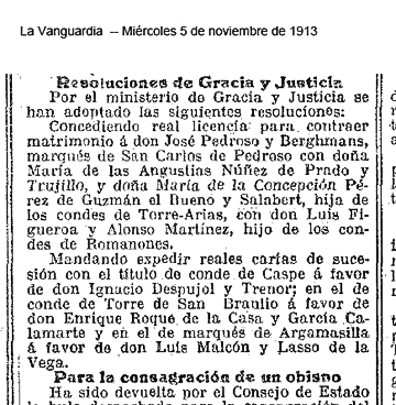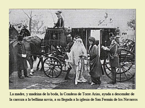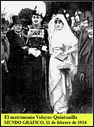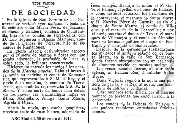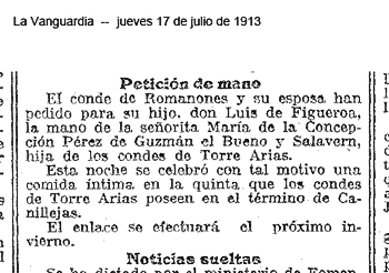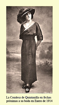 Es indiscutible que María Concepción reunía todas esas cualidades. Belleza física desde luego no le faltaba, como podemos apreciar en las fotografías que de ella disponemos y datadas en fechas próximas a su matrimonio. Este llegó muy pronto. Con sólo 17 años nos enteramos de que su mano ha sido pedida por los Condes de Romanones para su hijo primogénito Luis de Figueroa. Pronto empiezan los preparativos de la boda. Para que los contrayentes desfilen a los acordes de la marcha nupcial detentando ya títulos de nobleza propios ambas familias rehabilitan alguno de los que, teniendo derecho a ostentarlos, habían ya caído en desuso. Así María Concepción irá al matrimonio como Condesa de Quintanilla y el Romanones como Conde de la Dehesa de Velayos. |