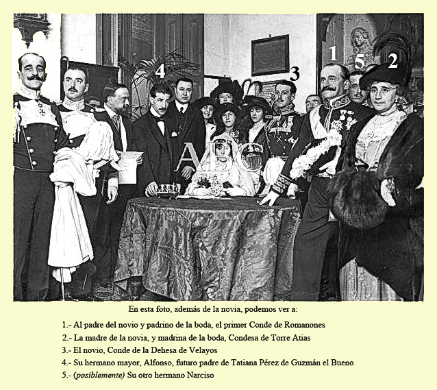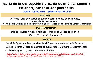 A lo largo de las diferentes entradas de esta WEB hemos repetido ya varias veces la digamos "filiación" de cada uno de sus personajes, pero vamos a repetir para los desmemoriados la de María Concepción, reflejada también en el cuadrado situado a la izquierda de estas líneas. Nuestra protagonista fue la tercera hija, y última, del matrimonio formado por Ildefonso Pérez de Guzmán y Gordón, Conde de Torre Arias y Marqués de Santa Marta y María de los Dolores Salabert y Arteaga, Marquesa de la Torre de Esteban Hambrán. Tuvo como hermanos a Alfonso y Narciso y casó con Luis de Figueroa y Martínez-Campos, primogénito del primer Conde de Romanones. Para los menos avezados en las cosas de la genealogía recordar que María Concepción fue tía carnal de Tatiana, la última Condesa de Torre Arias por línea directa y creadora de La Fundación Tatiana Pérez de Guzmán el Bueno. |